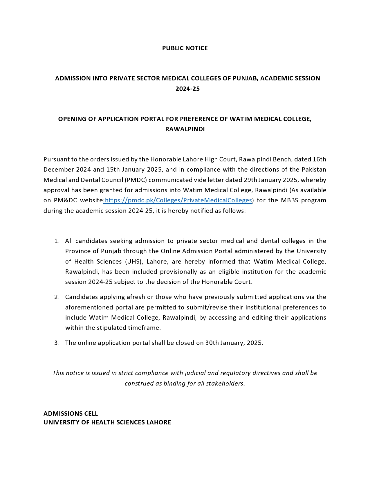 University of Health Sciences (UHS), Lahore Specialized Healthcare & Medical Education Department (SH&MED) Government of the Punjab